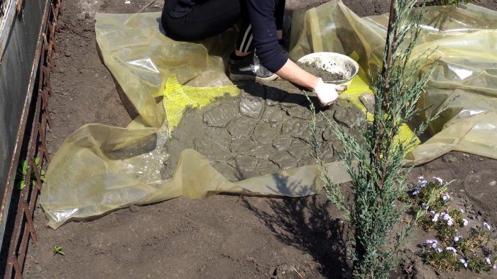 По периметру забетонированного котлована укладываются булыжники. Ежедневно бетон увлажняется, чтобы цемент правильно схватился и не образовал трещины. Затем через несколько дней пруд можно заполнить водой.