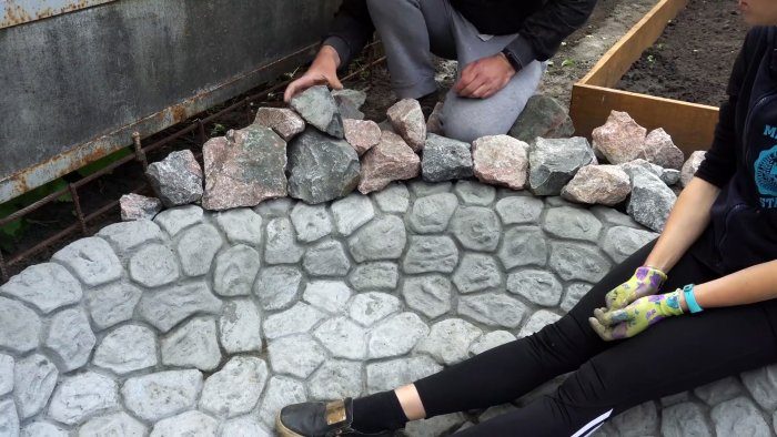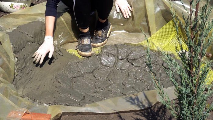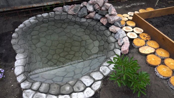 Начиная из середины нужно сымитировать на дне водоема камни. Это удобно делать просто руками. Чтобы цемент не разъедает кожу, стоит надеть резиновые перчатки. Для имитации камня нужно набирать комок густого бетона, класть его на стяжку и разглаживать, придавая форму камня. Между камнями оставляется шов на ширину пальца.