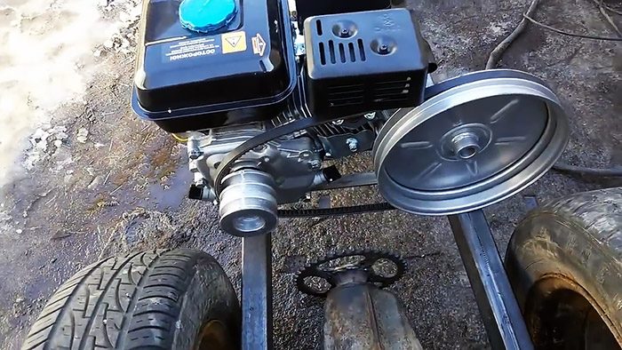 Приподняв одно колесо, запускаем двигатель и, прижимая куском трубы ремень к шкивам, убеждаемся, что крутящий момент от двигателя передается на колеса.