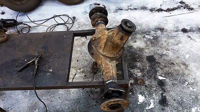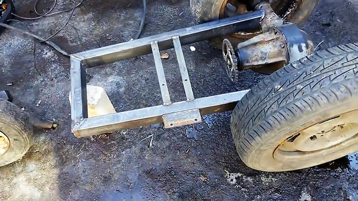 П-образную раму из прямоугольной трубы, усиленной в середине двумя поперечинами, привариваем концами к мосту симметрично относительно колес.