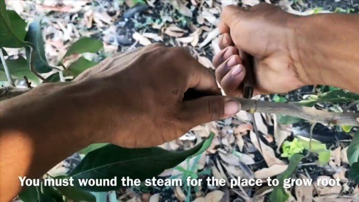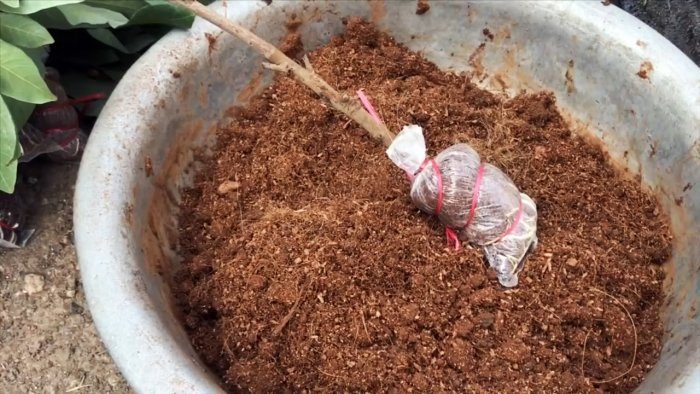 Затем берется небольшой завязанный полиэтиленовый пакетик с увлажненным грунтом. Землю в нем желательно смешать с мелкой древесной стружкой, чтобы она держалась комком. Пакетик надрезается вдоль, и зачищенная от коры часть ветки помещается в разрез. Затем ветка присыпается грунтом, стенки пакетика сводятся вместе и он укутывается шнурком.