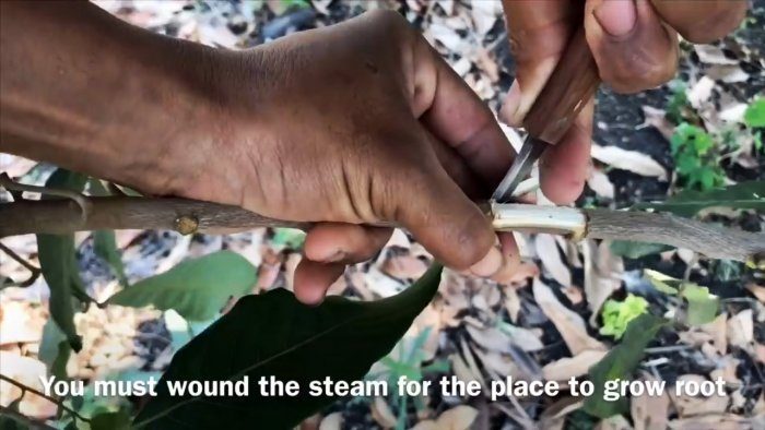 Способ подразумевает формирование саженца с корнем из живой ветки дерева. Его можно применять с весны и практически до конца лета. На маточном дереве подбирается достаточно ровная ветка возрастом 1-2 года. Острым ножом с нее снимается кора по кругу на ширину в 2 пальца. Нужно срезать верхнюю кору и зеленый камбий под ней.
