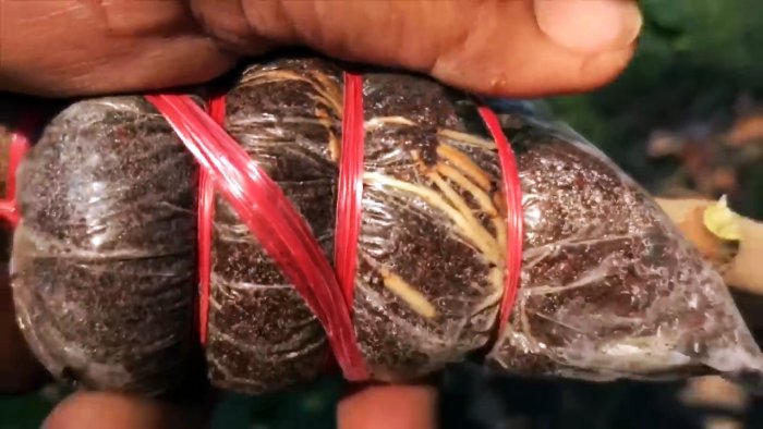 Ветка срезается ниже мешочка, и полиэтилен снимается. Ответвления от саженца нужно укоротить, так как мелкий корень не сможет их питать водой в достаточном количестве.
