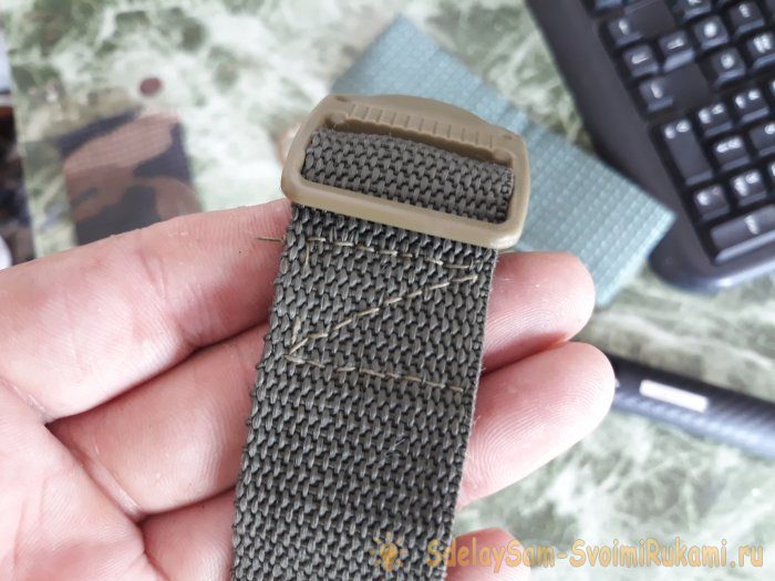 Далее, к одному из краёв каждой ленты, следует пришить пластмассовые пряжки. Во так: