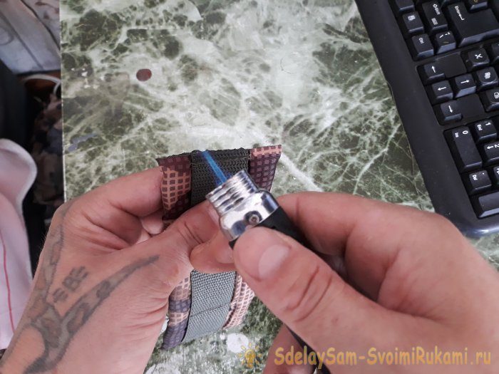 По полученным параметрам отрезаем два соответствующих отрезка от капроновой ленты. Разумеется, с хорошим запасом. Миллиметров 150, не меньше. Так же, необходимо подпалить зажигалкой края ленты, дабы она не распускалась.