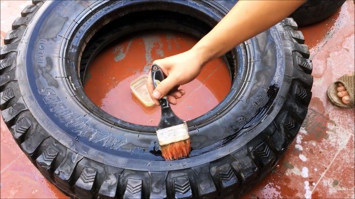 У покрышек среднего и большего размера нужно срезать боковину с одной стороны. Для этого их нужно промыть и смазать по линии реза маслом.