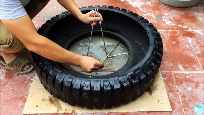 Большая шина укладывается ровно, под нее подстилается картон. Затем до середины ее бортика наливается бетон, в него утапливается сетка с арматурой.