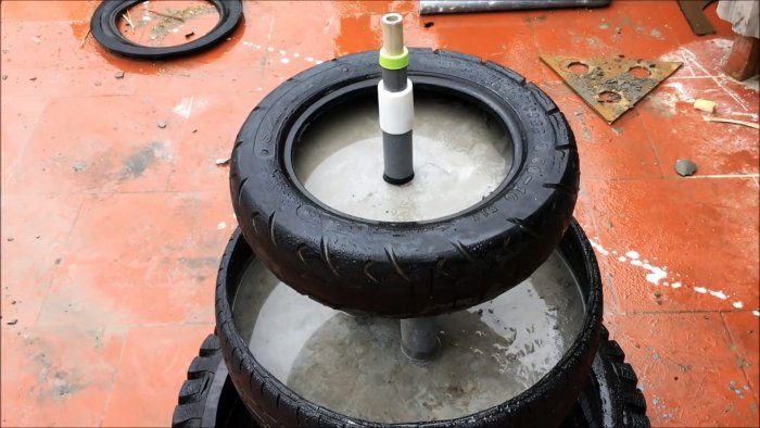 Последняя шина заливается бетоном уже без армирования. После разравнивания в центр ее дна насквозь вставляется трубка 32 мм. Затем шины оставляются до застывания цемента. Чтобы бетон не потрескался, после начального схватывания на него наливается немного воды.