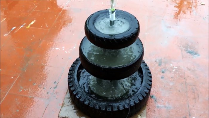 Трёхъярусный садовый фонтанчик из старых покрышек