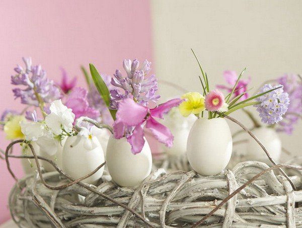 Конечно, цветы служат лучшим декором. Насобирайте крошечных цветов или бутонов и привяжите к яйцам, это самый простой и оригинальный способ украшения.