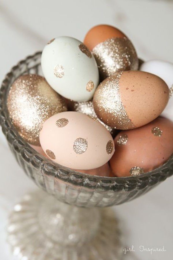 Список творческих проектов не будет полным без версии с блестками. Такой декор доступен даже детям, но, несомненно, добавит сияния Вашему Пасхальному столу!