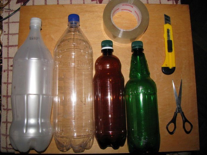 Вся конструкция будет двухцветной. Для этого берем две другие бутылки разного цвета и нарезаем их на лету ножницами.