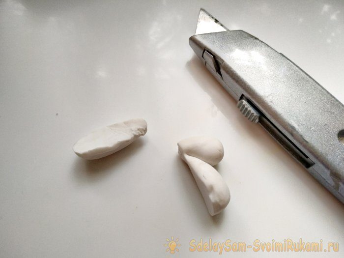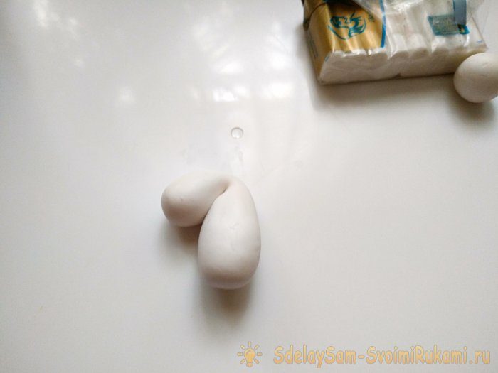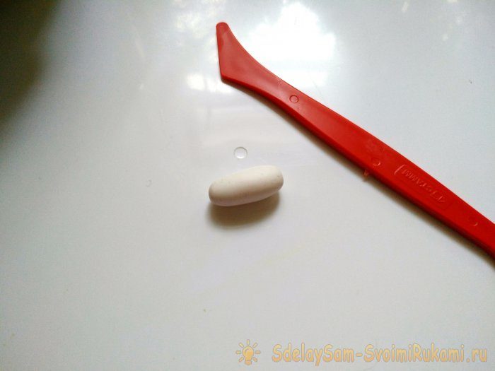 Отрежьте канцелярским ножом небольшой кусок полимерной глины белого цвета. Тщательно разомните в руках. Сформируйте продолговатую «колбаску» и небольшой шарик.