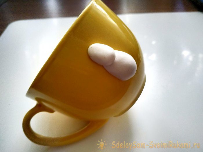 Совет! Все элементы изделия сразу закрепляйте на кружке. Это поможет обеспечить идеальное прилегание тыльной стороны фигурки к кружке.