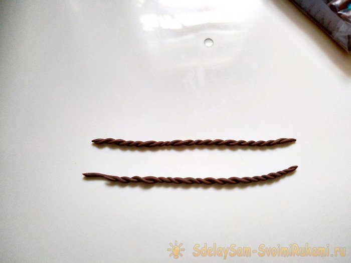 Скрутите одну пару «ниток» из глины жгутом от себя, а другую пару жгутом на себя. Такой способ скручивания даст эффект вязаного шарфа.