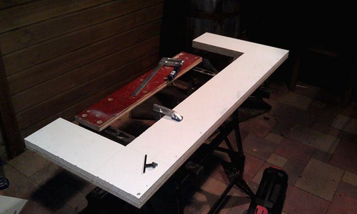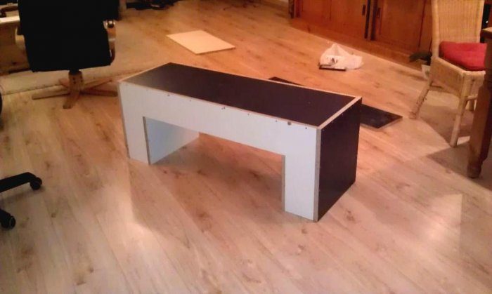 Затем закрываем основание плитой ДСП и заливаем ножки лавки.
