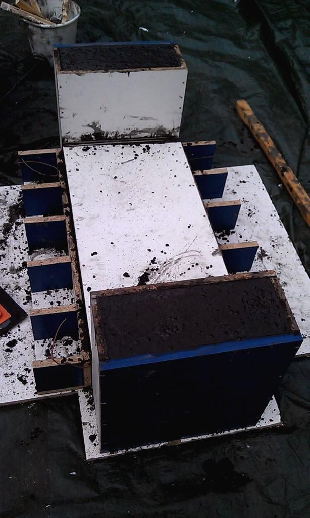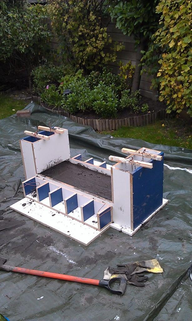 Готовим и заливаем бетон. Тут не все так просто. Сначала заливается основание лавки, тщательно утрамбовывается, чтобы не было воздушных пузырей.