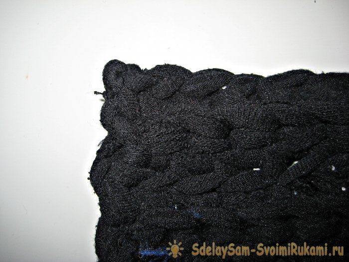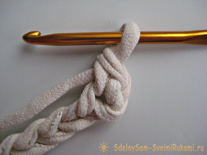 1. Приступаем к вязанию коврика. В данном случае будем вязать квадратный коврик размером 60 * 60 см. Для этого набираем крючком ленту из воздушных петель, равную 60 см.