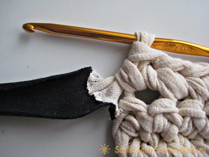 А изготовить его можно при помощи обычного крючка толщиной в 4 мм и нескольких футболок. Весь процесс изготовления коврика можно разделить на 2 этапа: 1 – изготовление трикотажной пряжи и 2 – вязание коврика из пряжи.