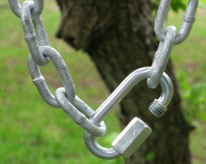 Делаем кольцо вокруг ветки и соединяем оба конца цепи соединением с резьбой — винтовым карабином.