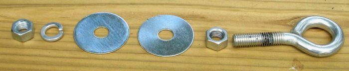 Шина в моей конструкции будет подвешена на трех опорах. Поэтому с другой стороны, где нет дождевых отверстий, сверли 3 отверстия, равно разнесенных друг от друга и вставляем в низ такие болты с кольцами. Затягиваем все ключом.