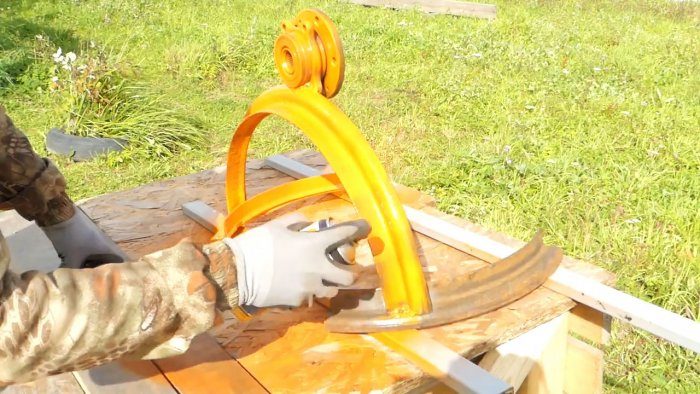 На самом верху к вертикальному элементу привариваем ступицу колеса от легкового автомобиля так, чтобы ее фланец был направлен в сторону длинных концов горизонтальных элементов.