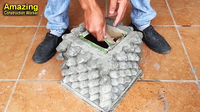 Переворачиваем цементный горшок дном вверх, срываем низ картонного короба, а в днище горшка проделываем ножом два дренажных отверстия для стока излишков поливной воды.