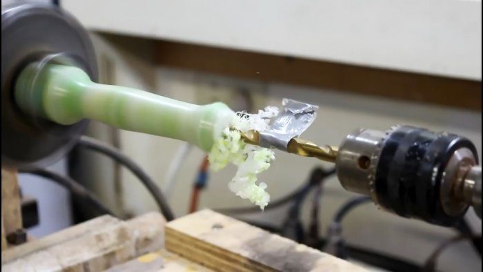 В процессе токарной обработки заготовки в ней обнаружилась небольшая пустота, возникшая в результате неполного выдавливания воздуха при формовке массы. Этот дефект мне удалость устранить, не снимая заготовку с токарного станка. Заполнив пустоту полиэтиленовой стружкой, я разогрел её промышленным феном и уплотнил размякшую массу шпателем.