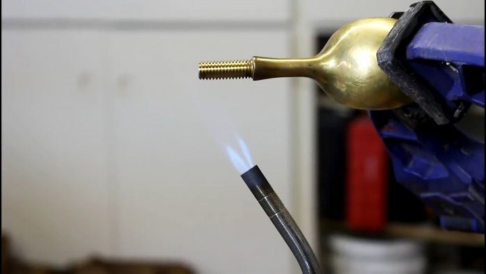 Для скрепления совка с ручкой я не использовал никакого клея. Так как конец совочка имел резьбовую часть, я просто разогрел её газовой горелкой (можно использовать конфорку газовой плиты) и вкрутил в подготовленное отверстие.