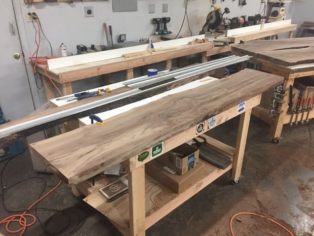 Наконец я нашел то, что мне было нужно в местном магазине. Не совсем в магазине. Оказалось, что у его владельца есть собственная пилорама и склад, на котором полно досок с необрезными краями. У него было несколько штабелей ореха из которых можно было сделать выбор. Здесь я и нашел то, что искал. У досок была идеальная ширина, выпилены из одного бревна (сохранялась симметрия), сушились в правильных условиях на протяжении 3-х лет, красивые и плоские, а цена была относительно недорогой. К ним прилагался бонус. Так как их обработали широким рубанком, то мне не нужно было устранять шлифованием неровно выпиленную поверхность. У меня нет рубанка шириной в 60 см…