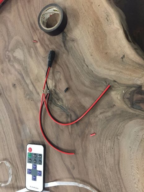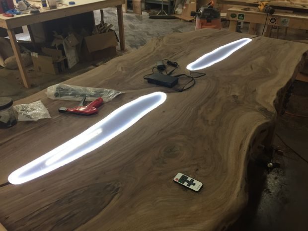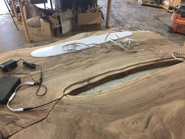 Прежде чем вставлять пластик, мне нужно было разобраться со светодиодной подсветкой. Для более изысканного эффекта я решил разместить LED-освещение по периметру пластика. Этот прием еще поможет скрыть провода. Я приобрел тонкую светодиодную ленту с клеящейся стороной, которую можно легко приклеить по углублению, которое я делал ранее вокруг нижней части полости. Я должен был собрать две отдельные электрические цепи в виде Y, которые затем должны входить в отдельный диммер. Диммер с одной стороны соединяется с аккумуляторной батареей и с другой с 12-вольтовым блоком питания. Это позволяет лампам светиться как от батареек, так и от сети. Идея заключается в том, чтобы хозяева подсоединяли зарядное устройство, когда не пользуются столом, и можно было бы убирать провода, когда они им будут мешать. Провода и батарея были закреплены на дне столешницы при помощи хомутов и анкеров. Я рассматривал вариант встраивания батареи и проводов в дерево, но окончательно решил, что лучше не стоит, так как все эти компоненты когда-то придется заменять. В конце концов этот стол должен стать семейной ценностью, которая переживет меня, клиента и светодиодные лампы. Говорят, что LED-лампы могут служить довольно долго, но, если возникнет желание, их можно будет заменить на что-то подобное.