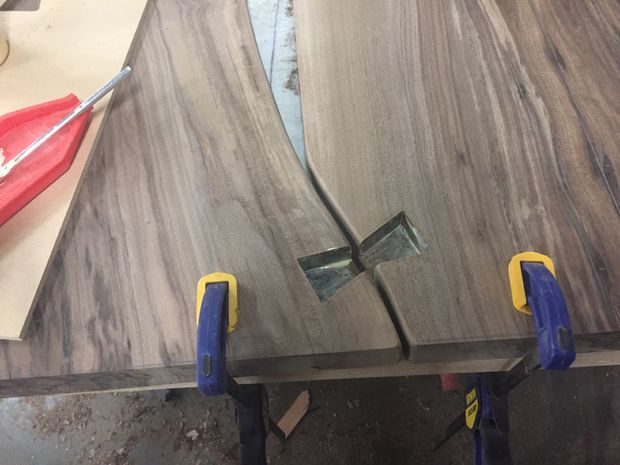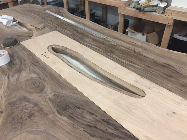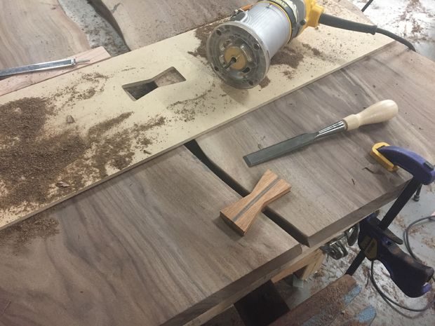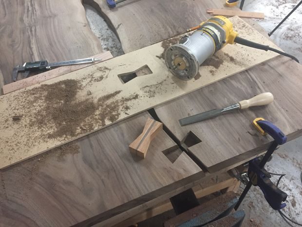 После выравнивания шва между досками, я зафиксировал их к столу при помощи струбцин. Затем, используя шаблон, я фрезером вырезал пазы. Там, где фрезер оставил паз округлым мне пришлось поработать стамеской. Можно было сделать «ласточкин хвост» с округлением, но мне нравится вид ровных углов.