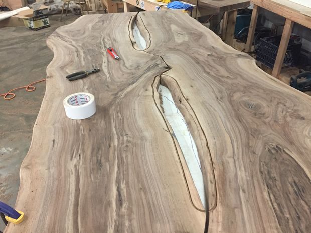 В большинстве случаев мне нравится, когда все сучки, трещины, пустоты фиксируются и заполняются черной эпоксидной смолой, особенно при работе с орехом. Черный цвет чаще всего выглядит естественно, а иногда придает контрастность. Так как в досках то тут, то там были довольно глубокие трещины, я использовал смолу с долгим временем застывания; это позволит ей хорошо впитаться и поможет действительно зафиксировать трещины, а не создать иллюзию заполнения. Недостаток этого метода в том, что почти всегда приходится снова наносить смолу второй, а бывает и третий раз. Иногда для повторной обработки я использую смолу с быстрым временем отвердения. Я заполнил все пустоты на обеих сторонах досок, чтобы их можно было надежно фиксировать. Наносить эпоксидную смолу лучше с «горочкой», чтобы при шлифовке не обнаружились пузыри (так они поднимутся выше плоскости доски).