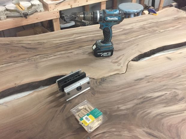 Для соединения центральных частей я использовал шканты. Они служат для фиксирования двух досок в одной плоскости (по отношению друг к другу). На шпонки и ножки стола ляжет основная нагрузка по фиксации столешницы. В отличии от шпонок, которые мне довелось встречать, эти я сделал толщиной почти равной толщине досок.