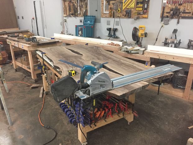 К сожалению этот этап я не особо задокументировал. По существу, я положил одну доску на другую в необходимом положении, и разметил область для удаления. Непосредственно для работы я использовал электролобзик, угловую щлифмашину (с диском-фрезой и лепестковым диском), и там, где необходимо, ручные инструменты для резьбы по дереву. На этом этапе было много тонкой работы и подгонки. По всей длине между досками я оставил шов толщиной примерно в 4 миллиметра. Я подумал, что так стол будет выглядеть более выразительно. С другой стороны, бесшовная подгонка оставляет углы, что не очень хорошо выглядит. Толщина шва будет сохранятся благодаря шпонке «ласточкин хвост». Затем я выровнял края стола с помощью дисковой пилы.