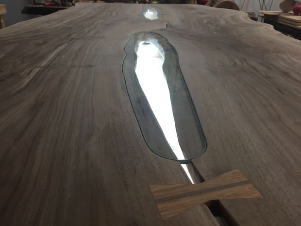 Сделанный на заказ обеденный комплект из ореховой доски с не обрезными краями, светодиодной подсветкой, стеклянными вставками и металлическими ножками.