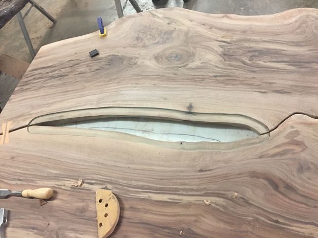 Я использовал модель САПР для создания вставок для стекла и поликарбонатной пластины. Двусторонний скотч отлично подошел для временной фиксации заготовок на поверхности стола. Затем я снова воспользовался ручным фрезером для создания пазов на обоих сторонах досок. Для более точной работы я использовал зензубель и стамеску, пока стекло не легло ровно и фиксировалось без колебаний. Стекло вынималось и вставлялось много раз, для этого я использовал присоски.