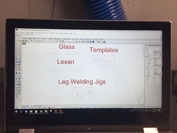 Для этого проекта я рисовал вектором разные проекции модели для всевозможных целей. Нарисовал очертания центральных полостей и экспортировал их в файл DXF, который затем отправил в стекольную компанию, чтобы они мне вырезали такие же формы. Этот же файл я использовал для изготовления шаблона с очертанием полости, по которому можно будет вырезать поликарбонатные пластины, которые будут крепится с нижней стороны столешницы. Шаблоны и поликарбонат я вырезал на своем самодельном фрезерном станке с ЧПУ. Еще я вырезал шаблон для фиксации частей металлических ножек, чтобы правильно их приварить. Я даже лазером вырезал профили различных металлических частей, которые мне будут помогать резать детали ножек под правильным углом. Спроектировав полную модель в САПР можно начинать работу, или по крайней мере с ней работать будет намного легче.