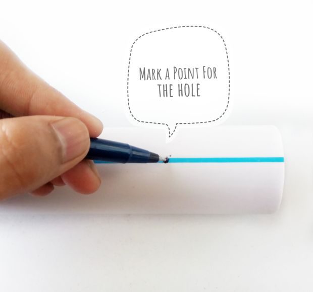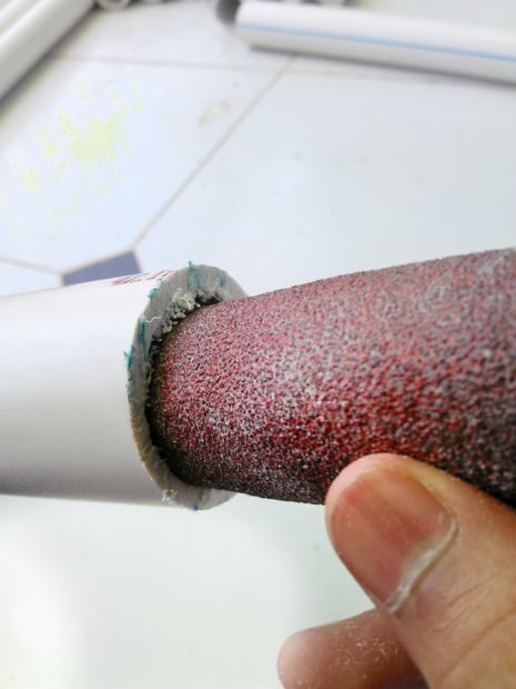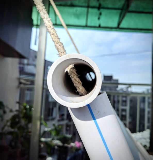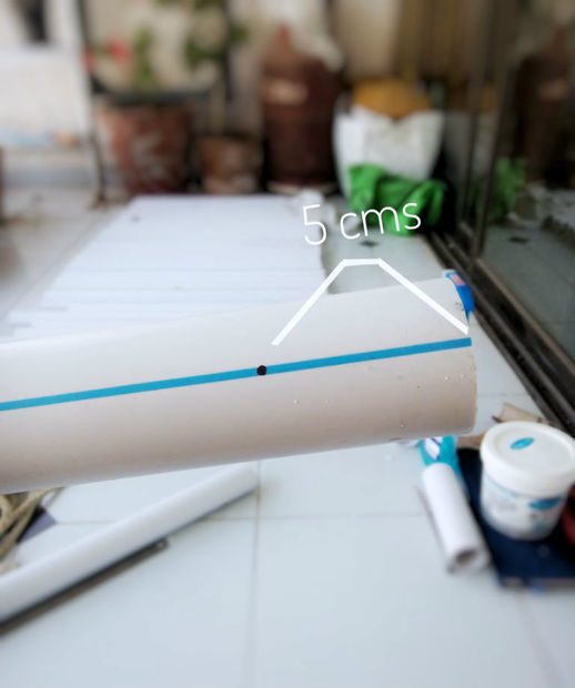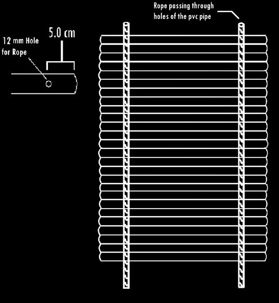 Для нанизывания на веревку в трубах нужно высверлить отверстия диаметром 12 мм. Но прежде чем делать это, нужно убедиться, что их диаметр будет соответствовать толщине веревки. Сначала нужно сделать метки в местах, где будете сверлить. Поставьте отметки ручкой на удалении 5 см от каждого края пластиковой трубы. Вам понадобится сверлильный станок. Так как у меня такого не оказалось, я обратился за помощью в мастерскую.