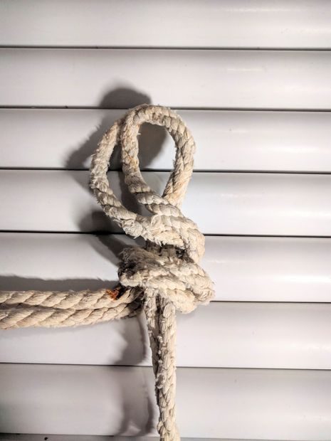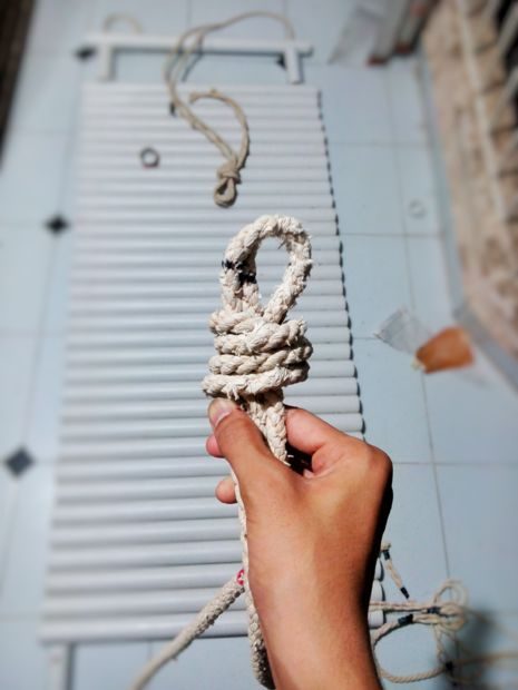 Необходимо завязать очень крепкие узлы, так как на них будет держаться весь гамак, и они не дадут ему соскальзывать. При помощи фото сложно объяснить, как завязать узел. Но в интернете можно найти множество подходящих вариантов. Главное, чтобы узел имел петлю. Фото подробно демонстрируют, какой вид узла был выбран мною.