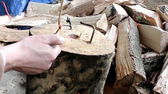 Теперь поджигаем лучинку и аккуратно вставляем в центральное отверстие.