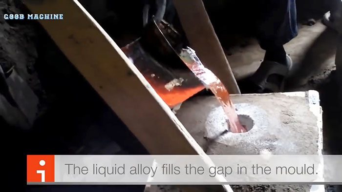 Тигель с расплавом клещами подносим к опоке и заливаем содержимое непрерывной струей до заполнения полости и литника. Если отливка сложной формы, сверху опоки делаем отверстия для выхода воздуха.