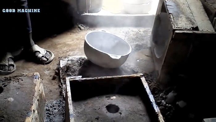 Насыпаем на негорючий пол формовочную смесь. Кладем на нее готовое изделие и уплотняем смесь под ним, придавливая формообразующий предмет ногами.