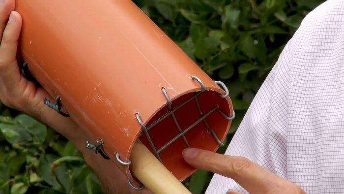 Устройство делается из куска пластиковой трубы диаметром 100-150 мм, длина примерно 40 см. Для вырезания отверстия можно пользоваться болгаркой или ножовкой. В торцах трубы надо фиксировать поволоку, требуется примерно 1 м диаметром 1–2 мм, для загиба и откусывания необходимо иметь плоскогубцы. Отверстия под проволоку высверливаются дрелью или проделываются горячим гвоздем соответствующего диаметра. Второй вариант предпочтительнее, сверлить гладкую круглую пластиковую трубу сложно. Приспособление прикреплено к длинной палке.Технология изготовления