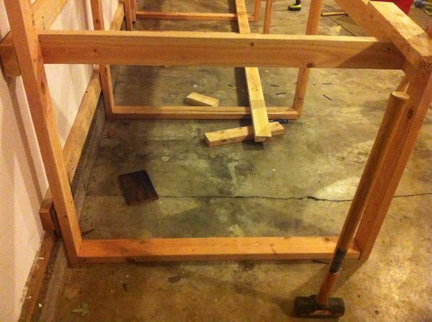 После того, как внешняя рама была готова, мы выдвинули ее наружу, обнаружив, что потолок немного провисает и упирается в нее. При помощи молотка, рама стала на нужное место, где мы ее закрепили на потолке. Далее нижнюю часть установили с помощью уровня так, чтобы стойки стояли вертикально.