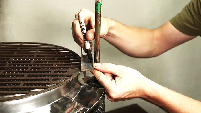 Примеряем отрезок уголка к приливу и стержню, отмечаем маркером место выреза в нижней полке и косые срезы от центра.