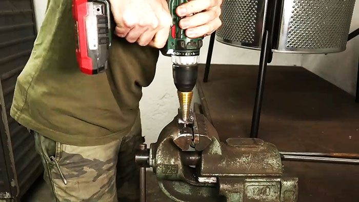 В трубах-ограничителях сверху выполняем отверстия дрелью со ступенчатым сверлом.