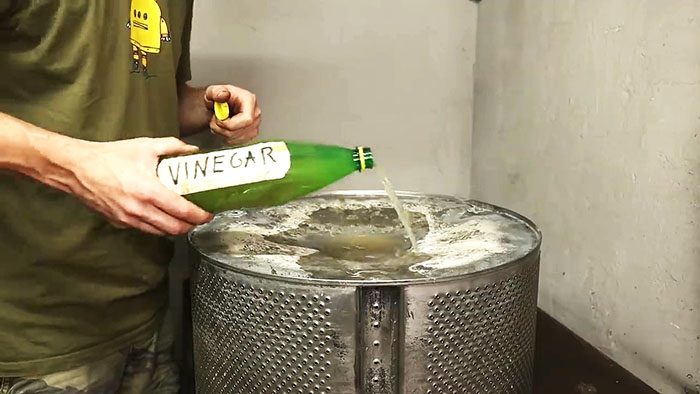 Заливаем в чашу дна, разбавленную водой уксусную эссенцию, и распределяем ее по всей поверхностям малярной кистью.