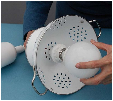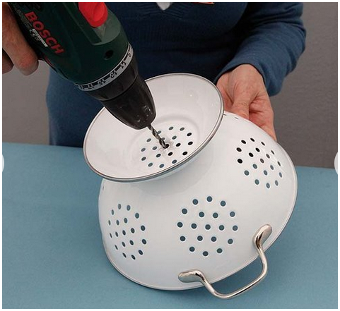 Этот проект как сделать светильник может дать второй шанс старому дуршлагу и превратить его в винтажный светильникк. Можно покрасить получившийся светильник, подобрав нужный цвет, который наилучшим образом координирует с Вашим декором из пространства.