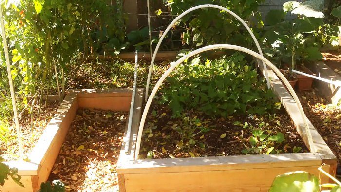Для чего это нужно, расскажем чуть позже. Для повышения надежности укрытия для растений полиэтиленовую пленку в нескольких местах можно закрепить к аркам с помощью кусков резиновой трубки длиной 75-80 мм и разрезанной по длине с одной стороны. Чтобы трубки не слетели под порывами ветра их можно закрепить с помощью подходящих зажимов.